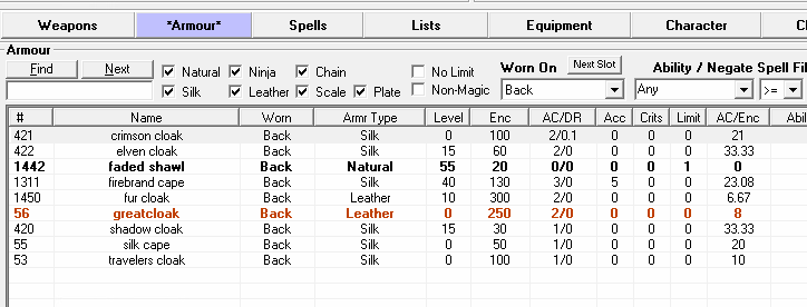 -NEW: This is a new "tab" under the "list" tab where the compare lists are. This will allow you to mark items as "CARRIED" in your inventory, which will allow their weight and abilities (where applicable) to apply to your character.