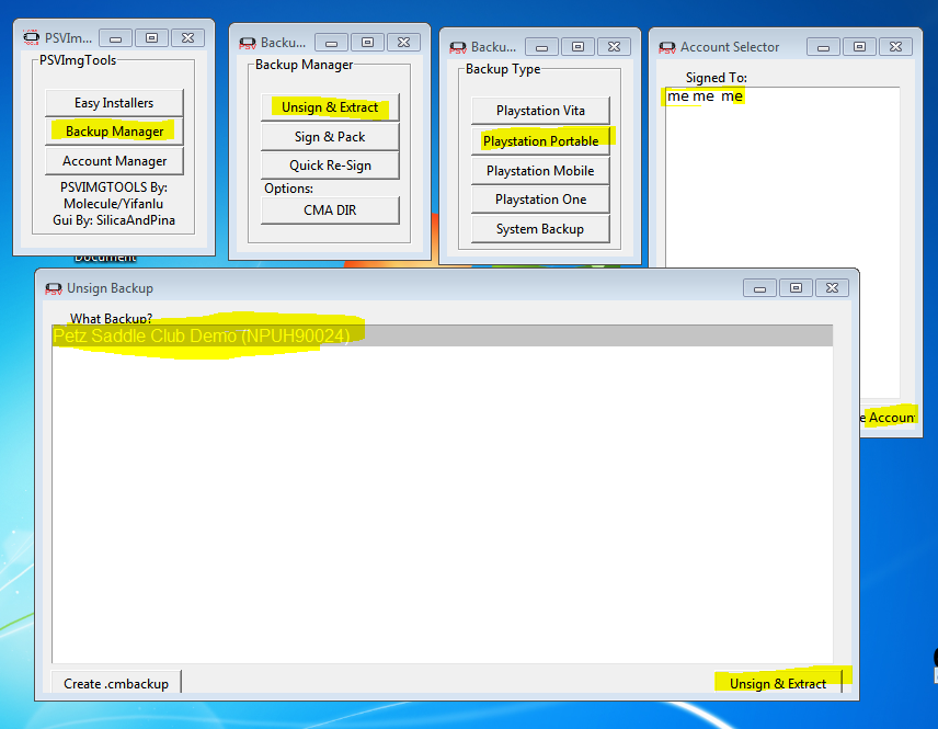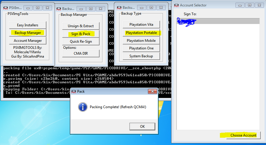 Backup Manager > Sign & Pack > Playstation Portable > Picked Game > Chose ME > Clicked Choose Account